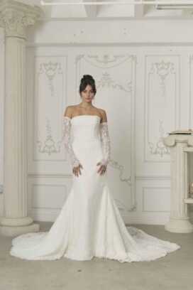 Minimalist and elegant, this strapless satin gown features a softly draped bodice and off-the-shoulder sleeves. The silhouette is sleek and sophisticated with a gentle flare and flowing train—perfect for a modern romantic bride.
