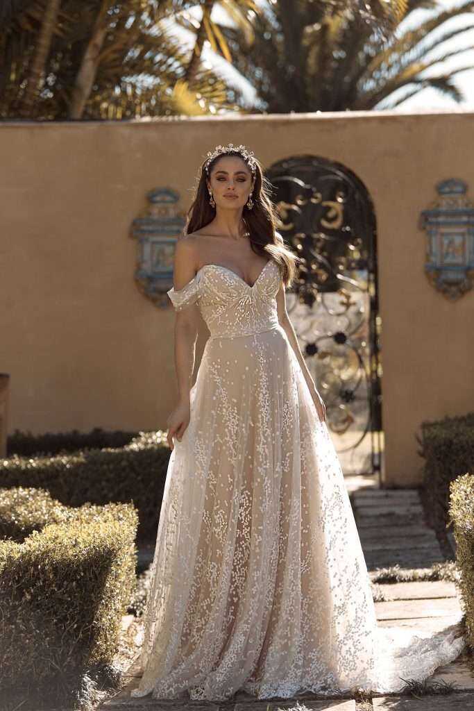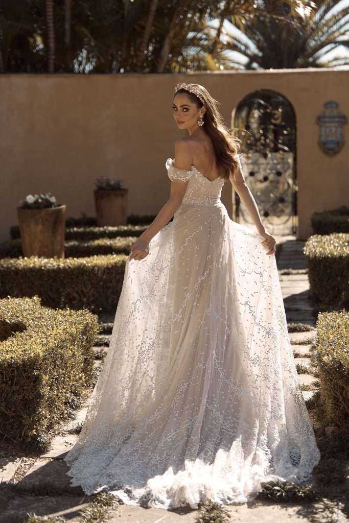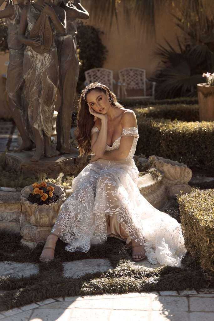Brilliant and bright is Bobbie as her energetic charm and bubbly personality become infectious; for those looking on simply can’t help themselves but smile. She’s joyous in the way she moves as her ever-popular Aline silhouette sweeps around in a pleated flocked spot tulle – a refreshing change to the more traditional floral lace. Bobbie accentuates the waistline with a soft belt, while her modest sweetheart neckline flows into an off shoulder pleated strap that drapes romantically. As she floats through the gardens, her butterfly like movements highlight her circle-cut skirt flowing over the hips with the same flocked tulle spot details sporadically moving over the tulle in varied concentrations. While Bobbie turns lovingly towards her partner, her back provides support and fit with a subtle V shape. She’s the perfect option for the bride who wants a little tradition in her silhouette but dances joyfully towards a modern twist.