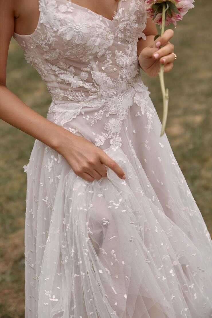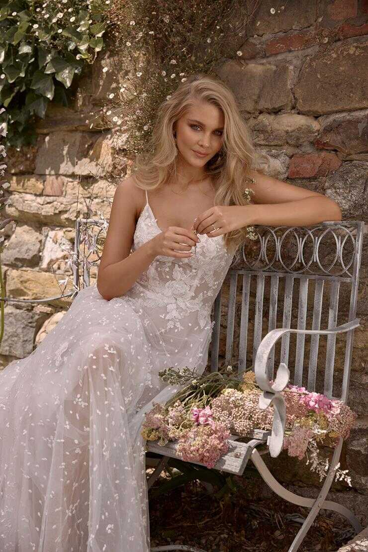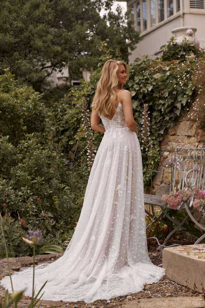 Cate blooms as she moves beautifully on her bride. Featuring the much loved Madi Lane signature Aline silhouette, with charmeuse lining. Designed with a modest V neck illusion bodice with rouleau straps. She features thoughtfully placed appliques, each flower blossoming brilliantly across the bodice. Her skirt is both romantic in its movement and modern in her lace design and details. Cate features a strong V back, mirroring her front in lace design. Compliment Cate perfectly with her matching cathedral length veil with embroidered spot lace.