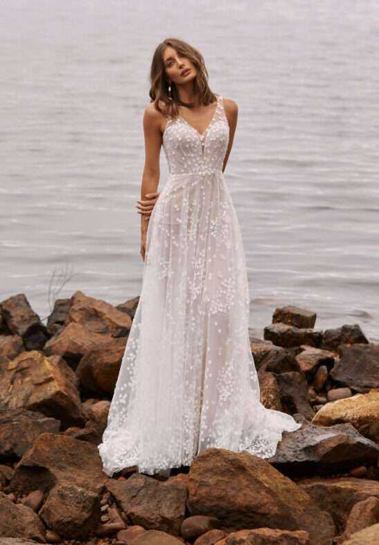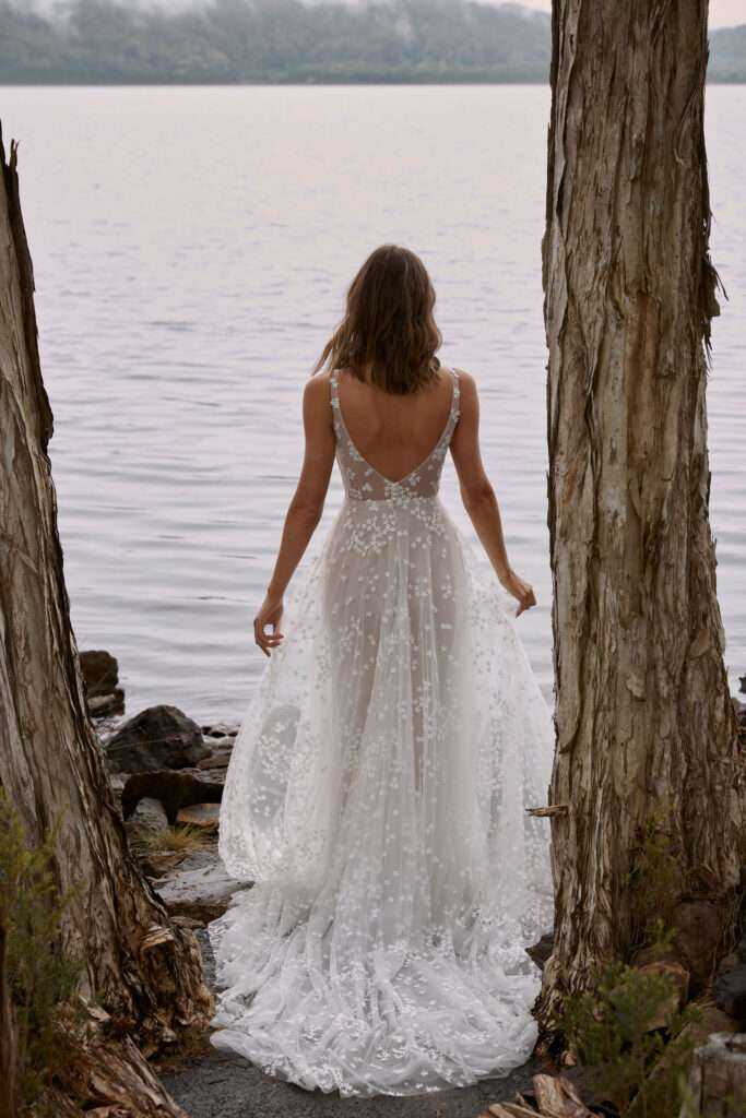 Celestial beauty Cyra will leave you starry-eyed from the moment you see her. Lined in our charmeuse lining to give that luxurious feel against the skin, her fitted Aline silhouette is a much loved favourite. Featuring a modest plunging neckline with tapered illusion tulle straps, she is full of detail and dimension. Her fitted Aline skirt silhouette with fitted underlay allows her brides silhouette to shine through adding to the magic that is Cyra. The star-like flowers scatter throughout the skirt adding to the As she turns to walk away she dazzles once more with her stunning illusion V back, designed to perfection for a perfect fit. Her tulle skirt gently skims over the hips into a sky of stars that flows into a full 25 inch train.