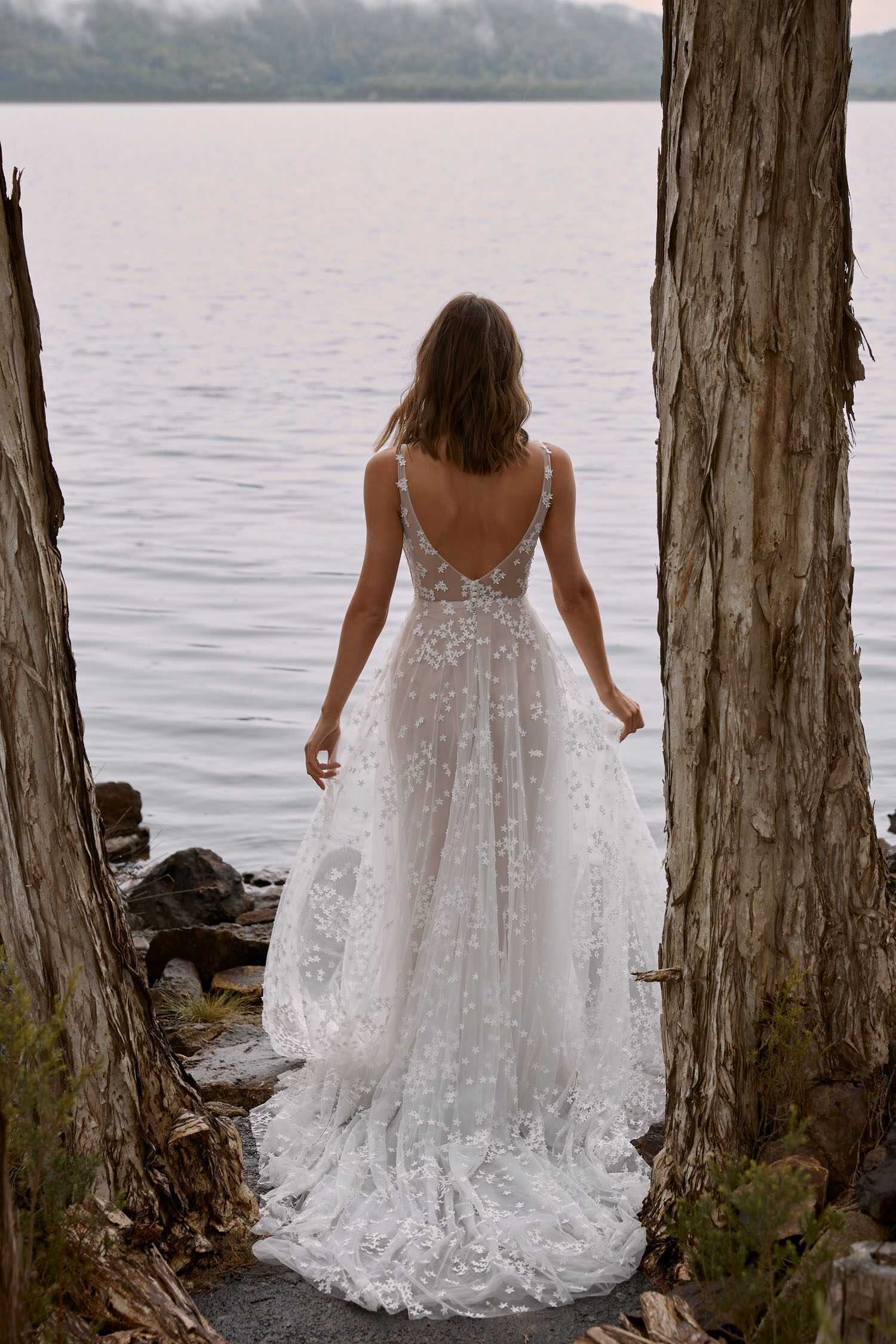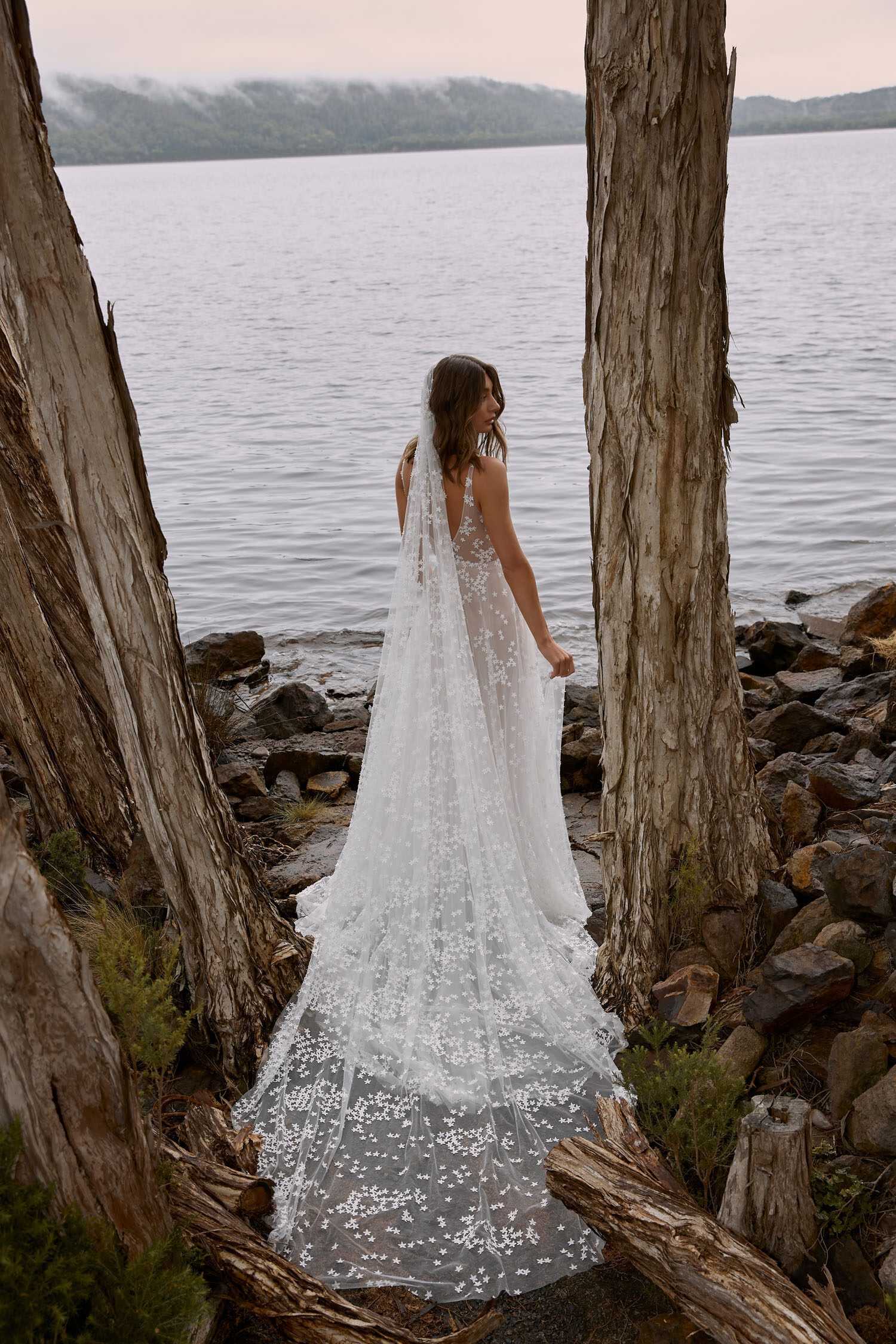 Celestial beauty Cyra will leave you starry-eyed from the moment you see her. Lined in our charmeuse lining to give that luxurious feel against the skin, her fitted Aline silhouette is a much loved favourite. Featuring a modest plunging neckline with tapered illusion tulle straps, she is full of detail and dimension. Her fitted Aline skirt silhouette with fitted underlay allows her brides silhouette to shine through adding to the magic that is Cyra. The star-like flowers scatter throughout the skirt adding to the As she turns to walk away she dazzles once more with her stunning illusion V back, designed to perfection for a perfect fit. Her tulle skirt gently skims over the hips into a sky of stars that flows into a full 25 inch train. Pair Cyra with her matching 1 tier cathedral length veil, together they are a match made in heaven.