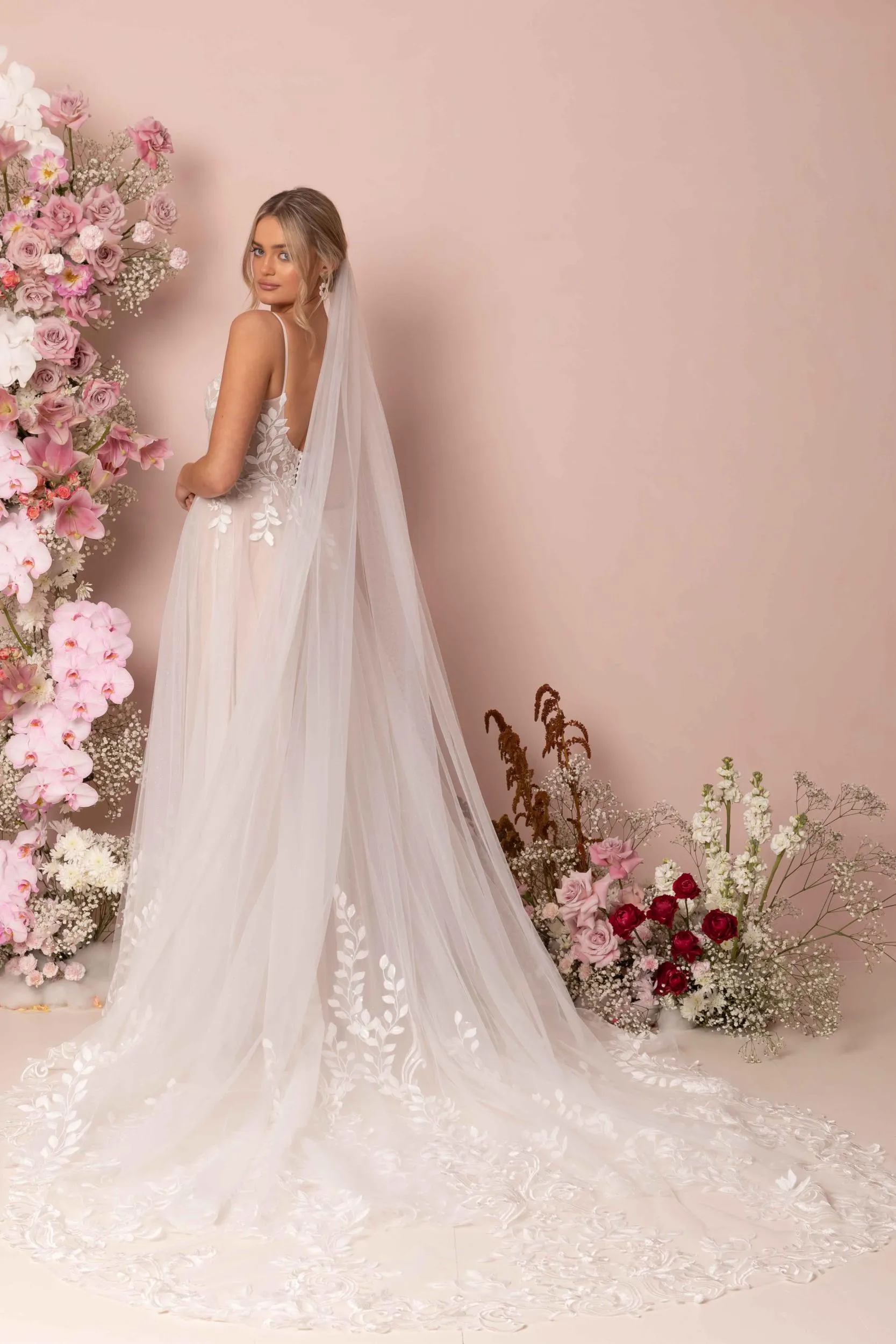 Be a vision of femininity with her classic A-Line silhouette crafted with a 3/4 circle skirt that flows into a sweeping 33’ train with climbing botanic applique.