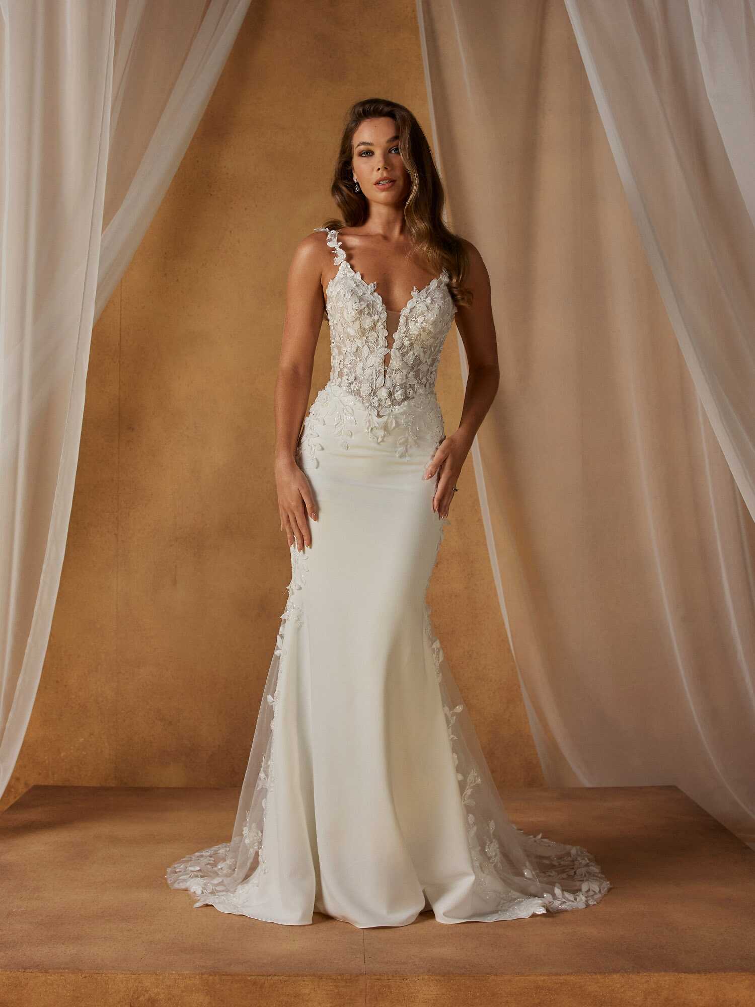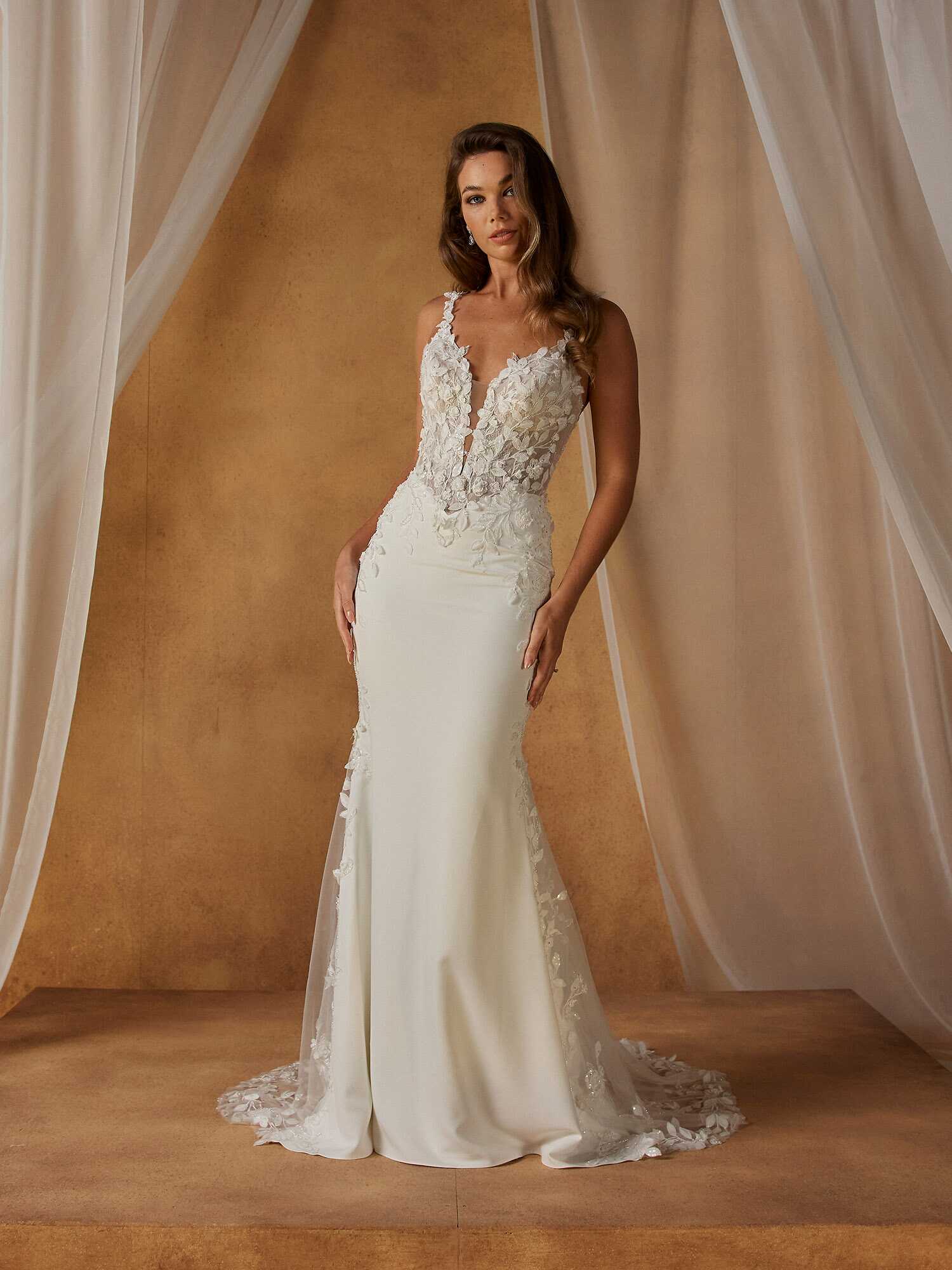 Niall-Lee wedding dress is a modern expression of romance, combining soft shapes with luminous, intricate detailing. The fit-and-flare silhouette follows the body’s natural curves, creating a graceful and feminine shape that moves with elegance. A plunging V-neckline is softened by beaded floral motif shoulder straps, adding delicate sparkle and refined texture.