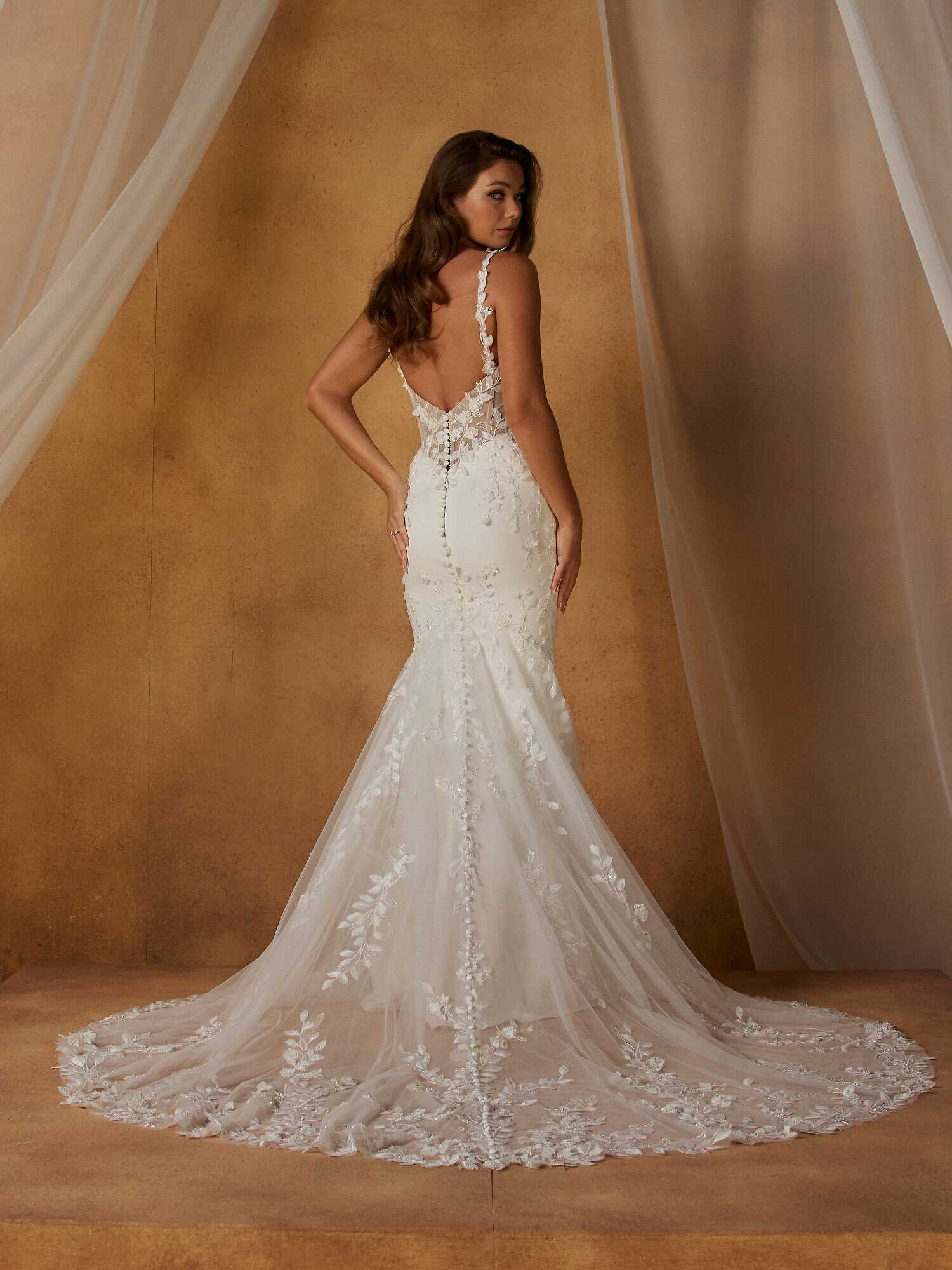 A clean crepe skirt drapes from the waist, offering a modern, sleek finish that complements the detailed bodice. The low illusion V-back closes with a row of delicate buttons, extending seamlessly into a soft, flowing train.