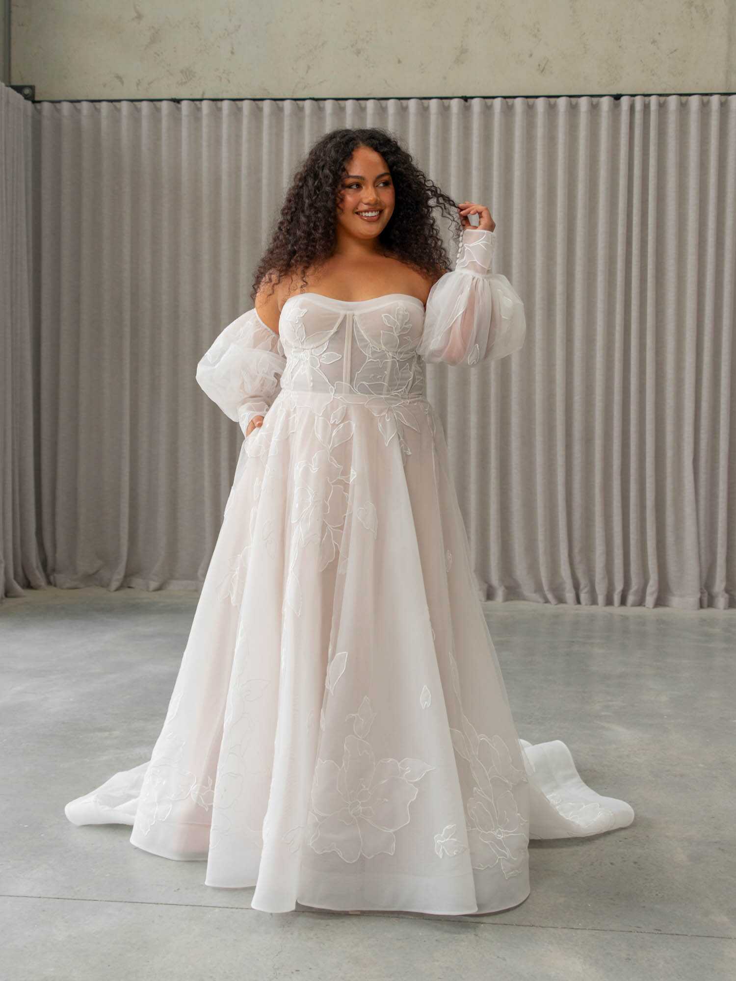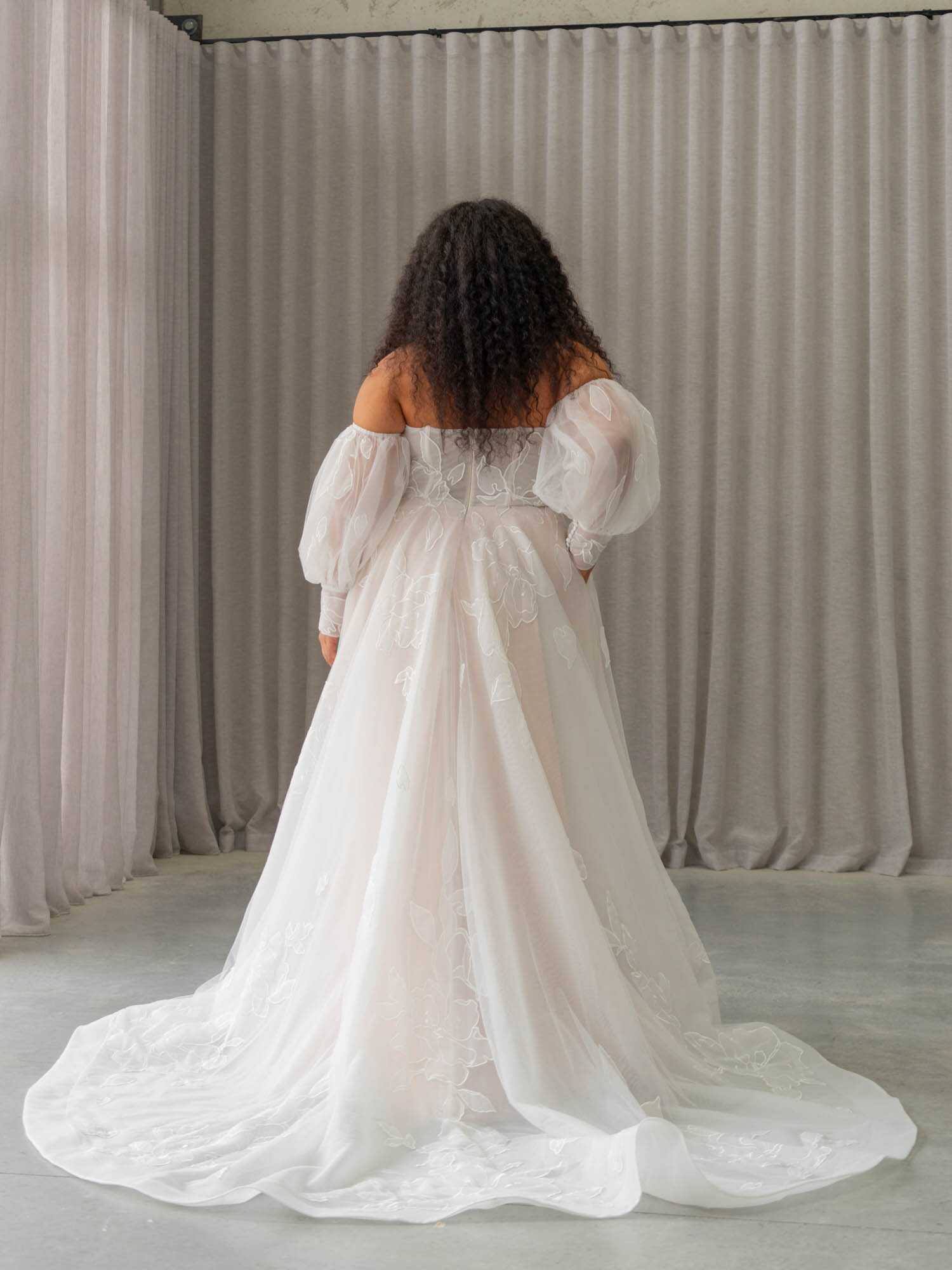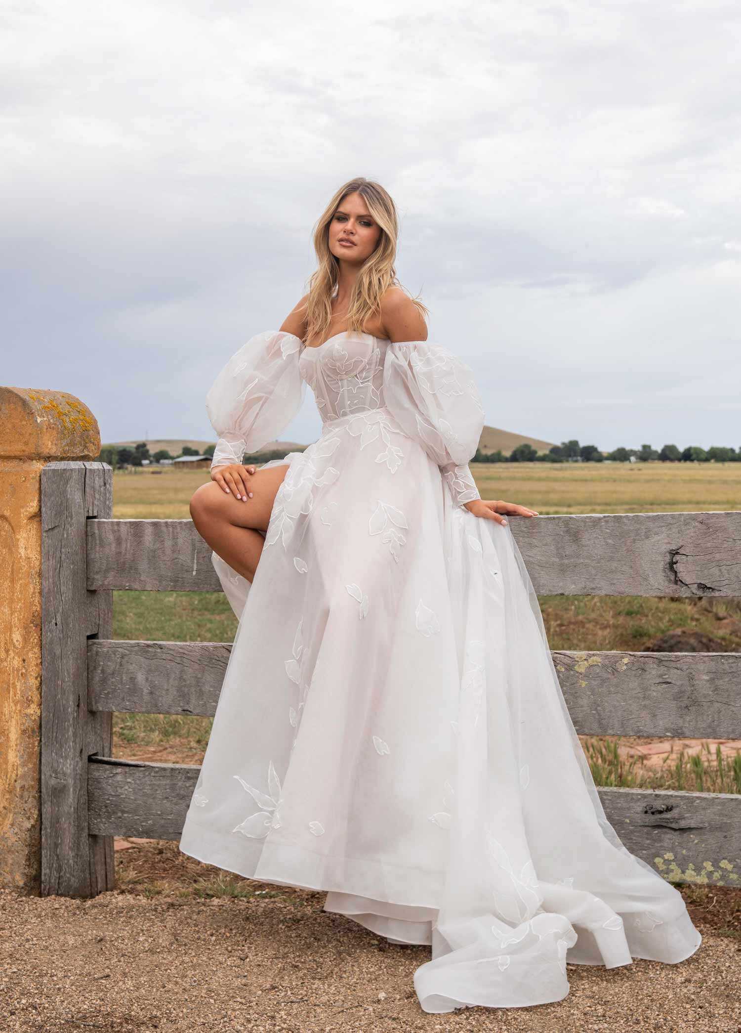 Ethereal and romantic is Tessa from our Madi Lane Ceres collection. An A-line wedding gown which looks like the bride is floating on air. This beautiful silhouette is enhanced with a contemporary abstract floral embroidered lace placed perfectly to frame the shape from illusion bodice to hem. Included in the Tessa design is stunning detachable illusion off-shoulder balloon sleeves with wide cuffs, which offer coverage, and are a premium Madi Lane signature feature. Her soft neckline details boned construction for a secure fit and modern panelling detail. The Aline skirt features a soft and sexy leg split, with a sweeping illusion train, expertly crafted to keep that soft fullness and add hem dimension. Feel every moment of your whimsical wedding journey in Tessa. Shown in ivory and mocha in sizes 2 to 28.