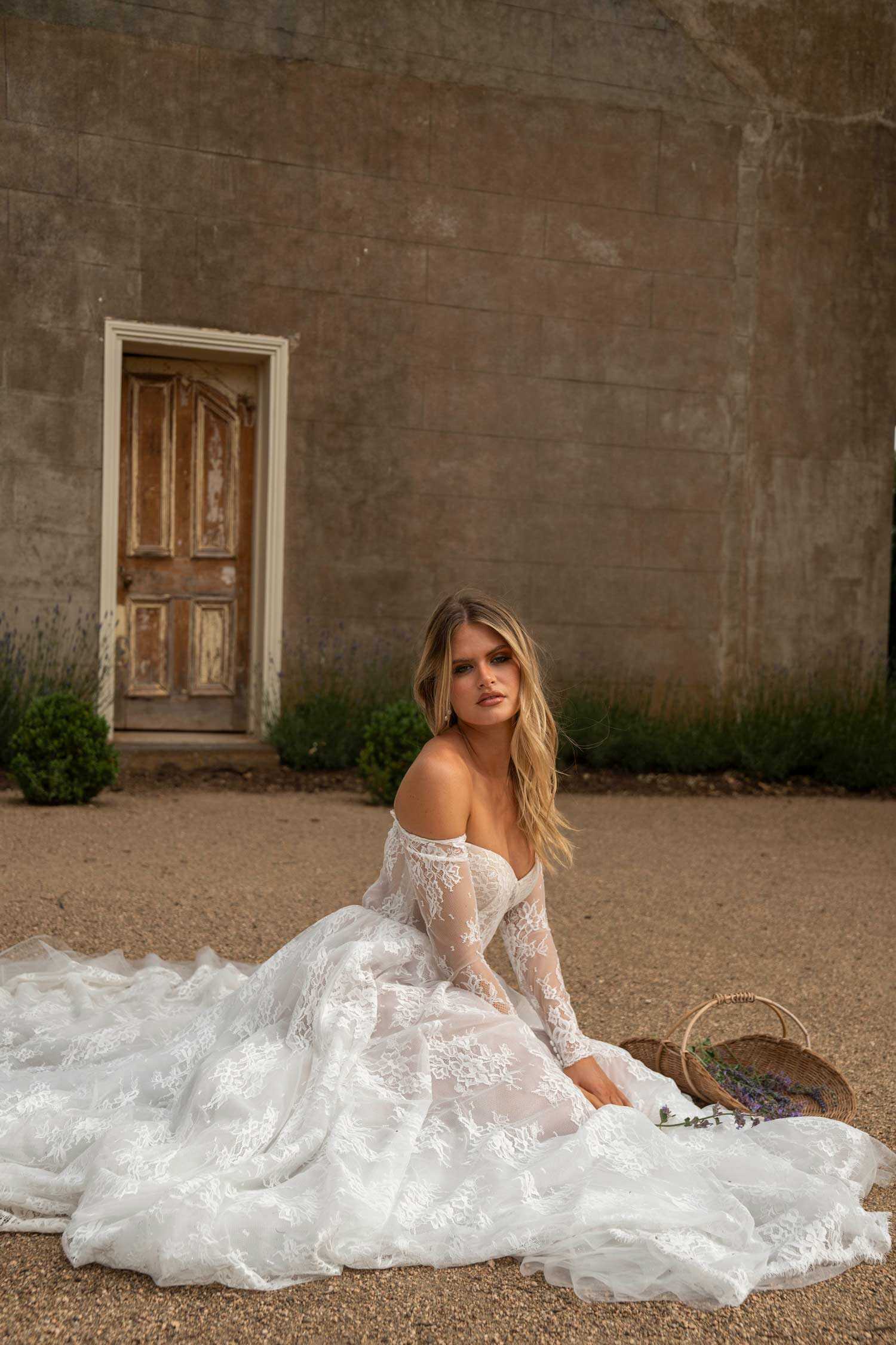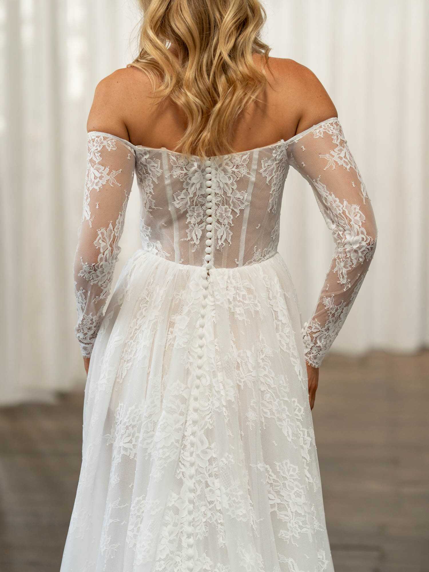 Introducing Trina, a modern interpretation of Chantilly lace, layered over glitter tulle for a hint of shimmer. With a sweetheart neckline and moulded cups, her boned bodice creates a stunning snatched waist with a contemporary barely-there aesthetic. Extremely popular in global bridal trends, the off-shoulder matching lace sleeves beautifully frame the body front and back and add coverage. Her illusion lace skirt has a light sheer quality which is an aesthetic turning heads on runways, combined with nude jersey shorts that are both comfortable and modest. The back achieves good coverage and features vertical buttons that flow right through her A-line skirt to the hem of her train. Celebrate your fashion-forward style with the effortless modernity of Trina, from our Madi Lane Ceres Collection. Available in sizes 2 to 28.