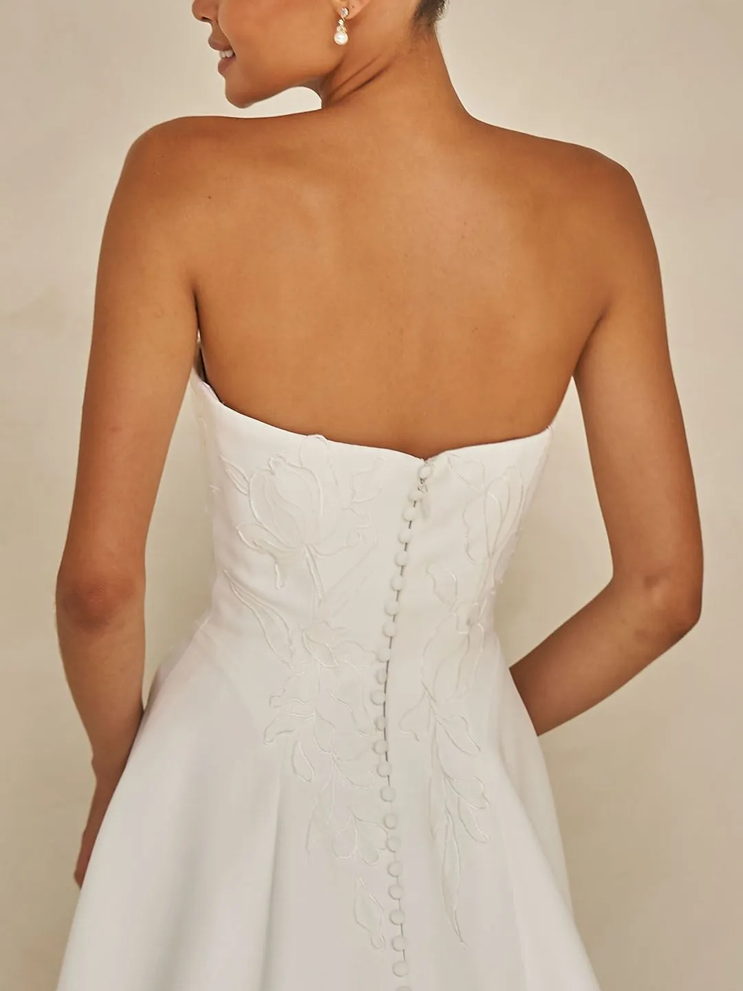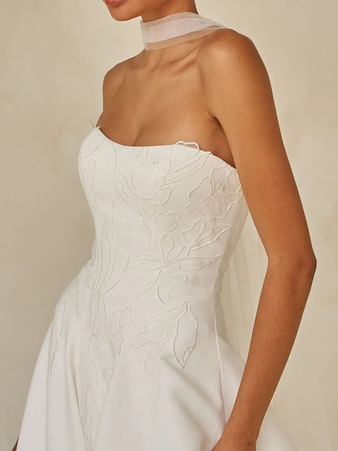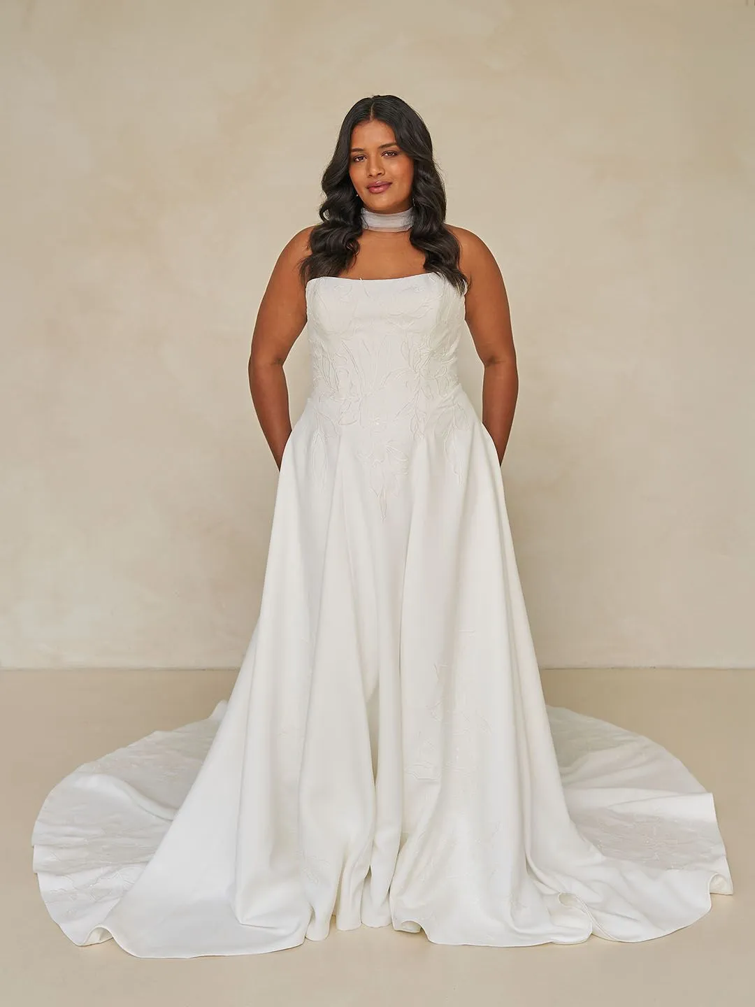 Elegant A-line gown with a strapless design and lace overlay.