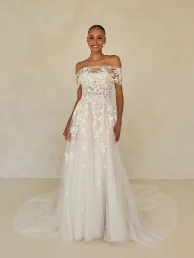 Included, is the sweet off-the-shoulder tulle shawl to add coverage, dimension, and additional variety in styling. All together creating an ultra-romantic, ethereal look for the bride who craves her fairy-tale moment on her wedding day.