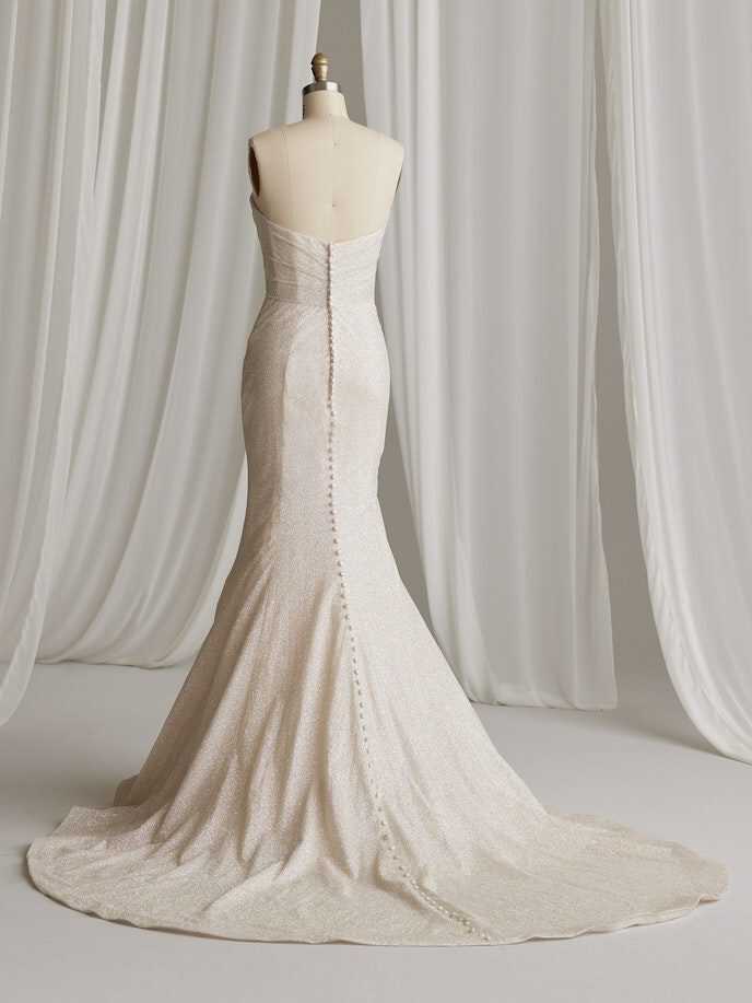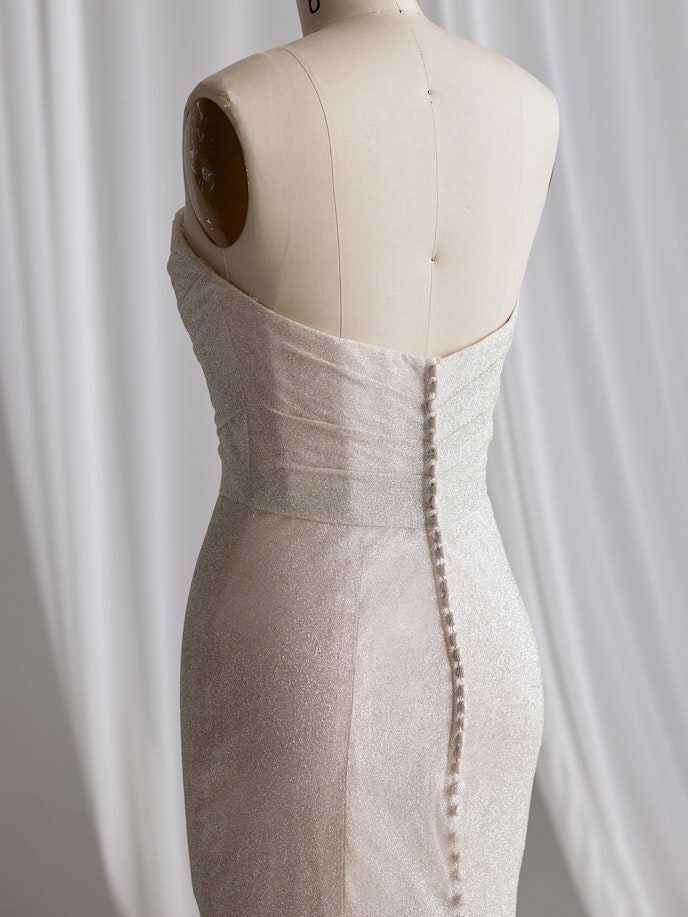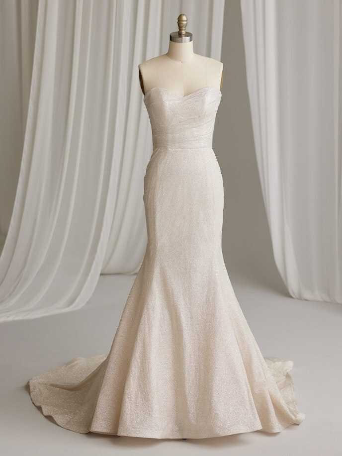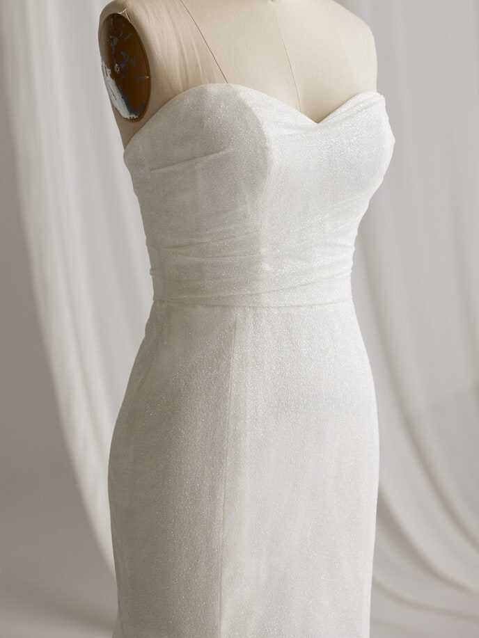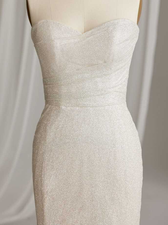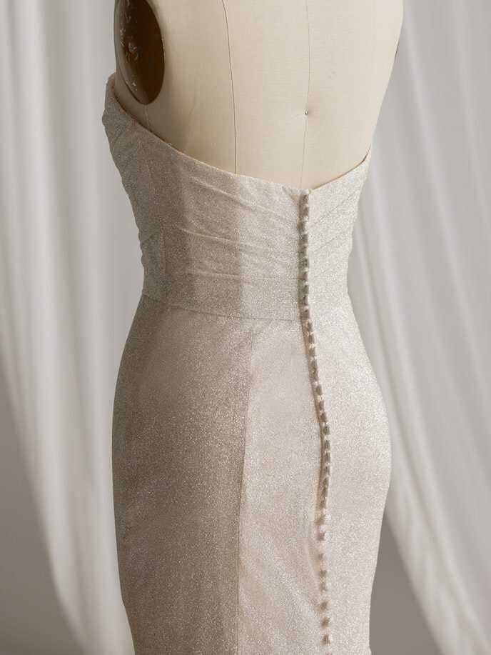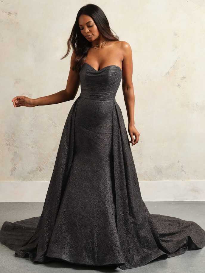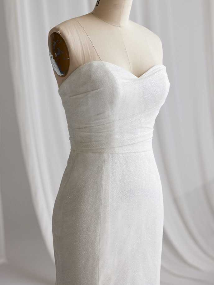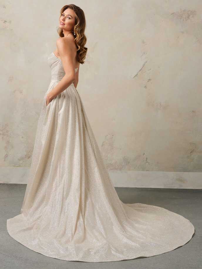 A wedding look can be many things, and sometimes you just need it to be really, really pretty in a chic and simple way — under which we file this glitter fit-and-flare bridal gown with soft shimmer and a lovely strapless bodice.