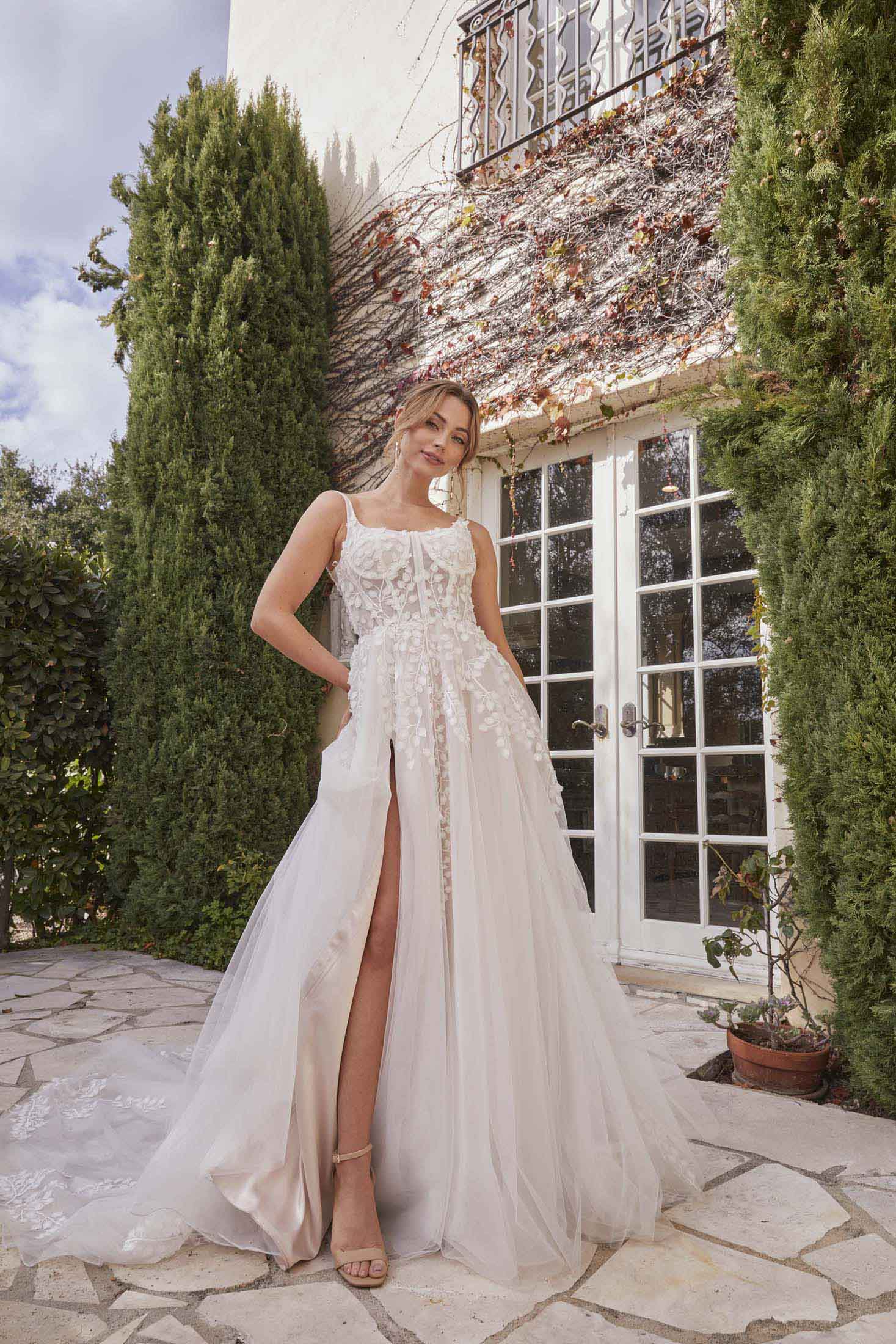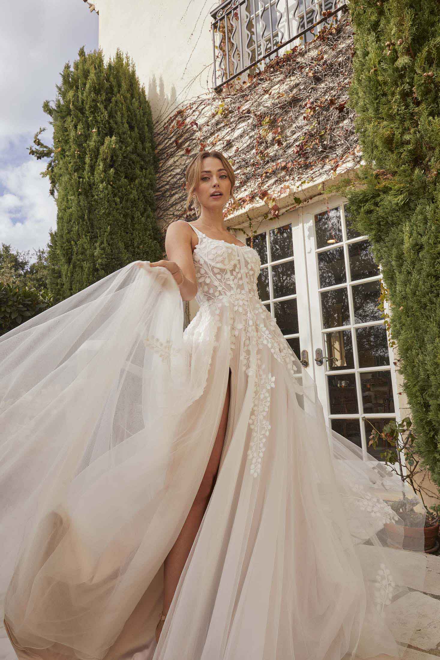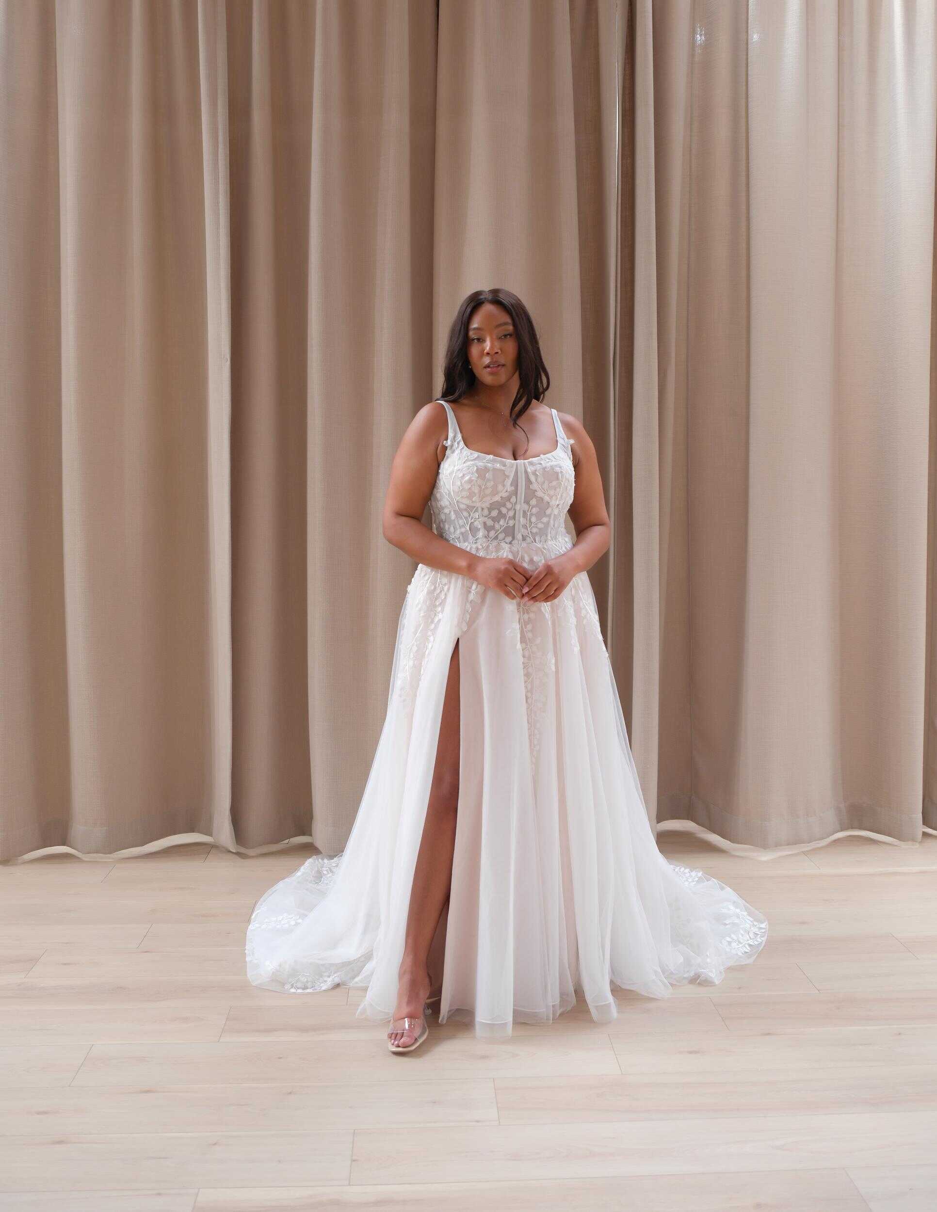 The Dawn wedding dress embodies a delicate yet captivating allure, ideal for the romantic bride seeking an enchanting presence on her wedding day. Crafted from exquisite lace and ethereal tulle, the bustier square neckline adorned with a petal motif front and back exudes timeless elegance with a touch of whimsy. Thin lace and tulle straps delicately frame the shoulders, adding a hint of ethereal charm. The flowy tulle skirt, embellished with intricate floral lace appliqués, cascades gracefully to the floor, while a thigh-high slit offers a subtle yet alluring detail. Inspired by the soft light of the dawn breaking over a serene landscape, this dress is perfect for an intimate garden ceremony or a romantic beach wedding, capturing the essence of natural beauty and timeless romance.