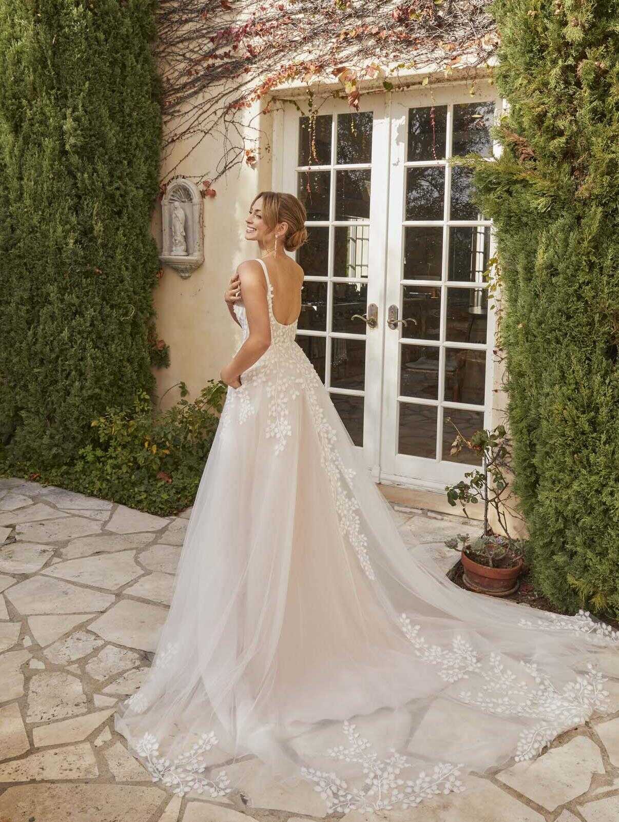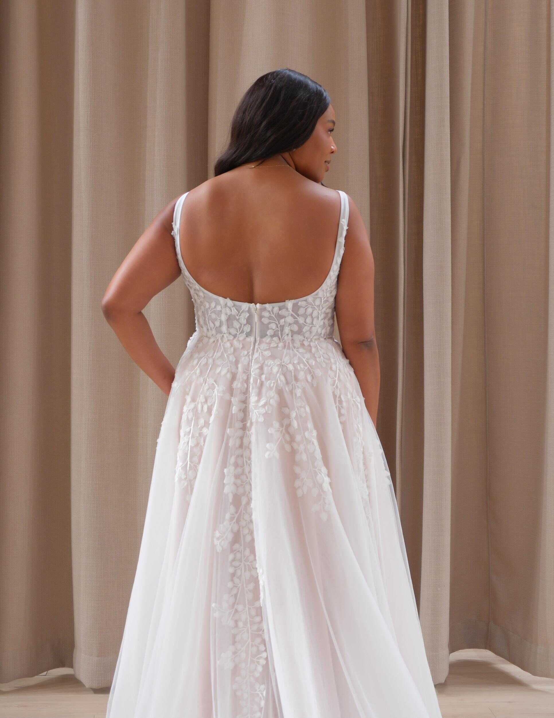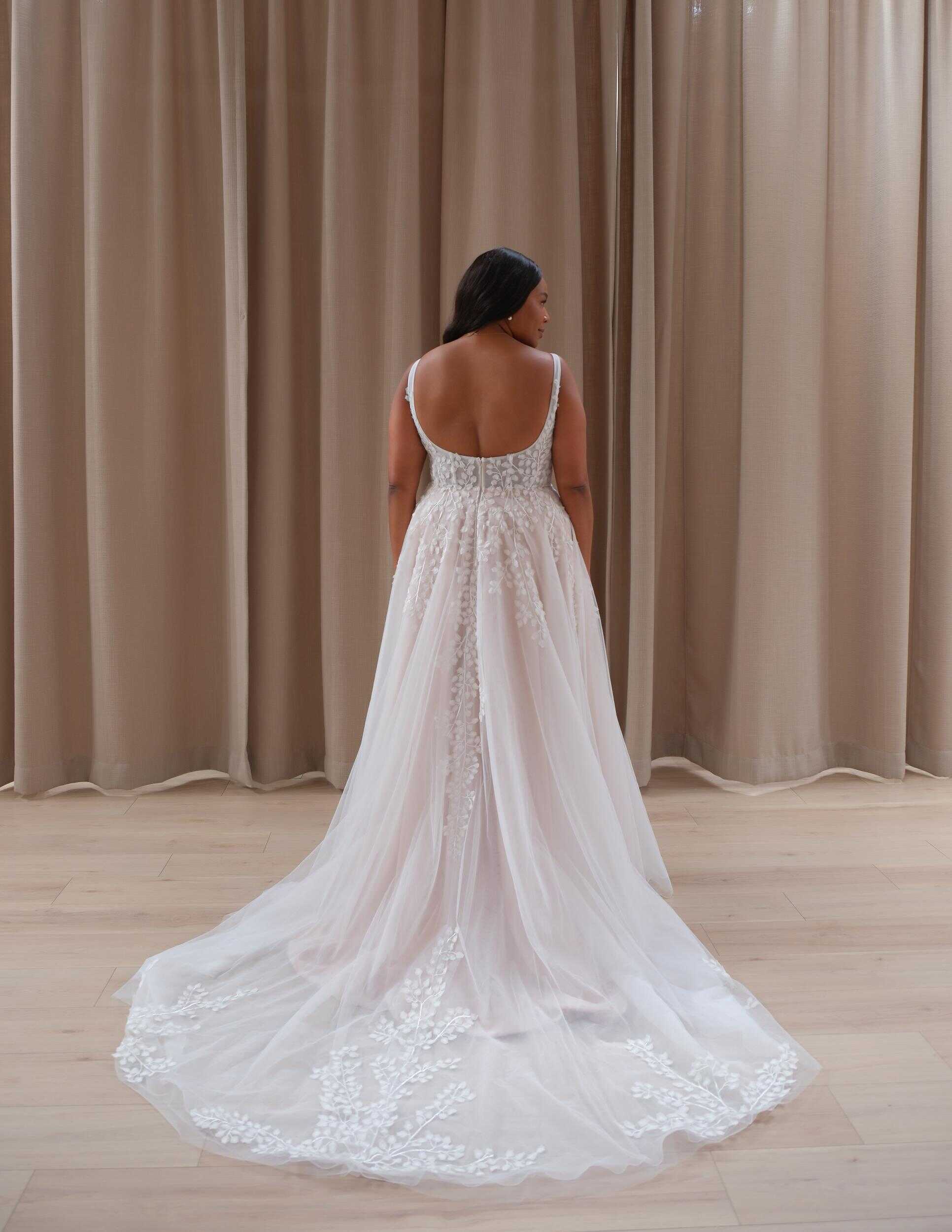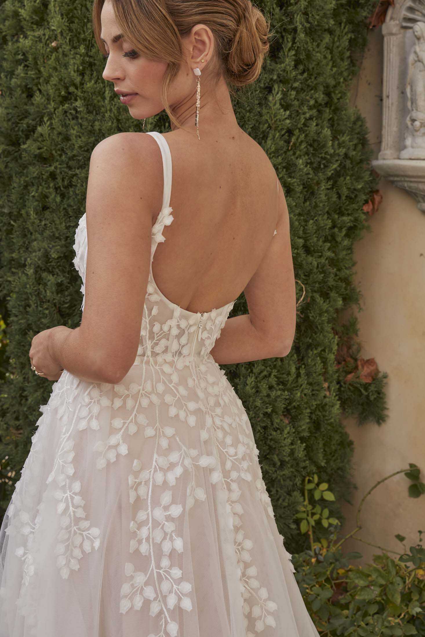 Enchanting lace and tulle gown with a petal motif bustier neckline, perfect for the romantic bride’s special day.