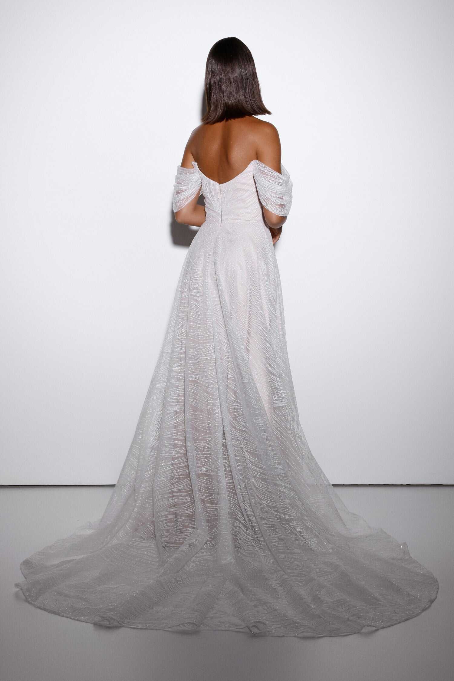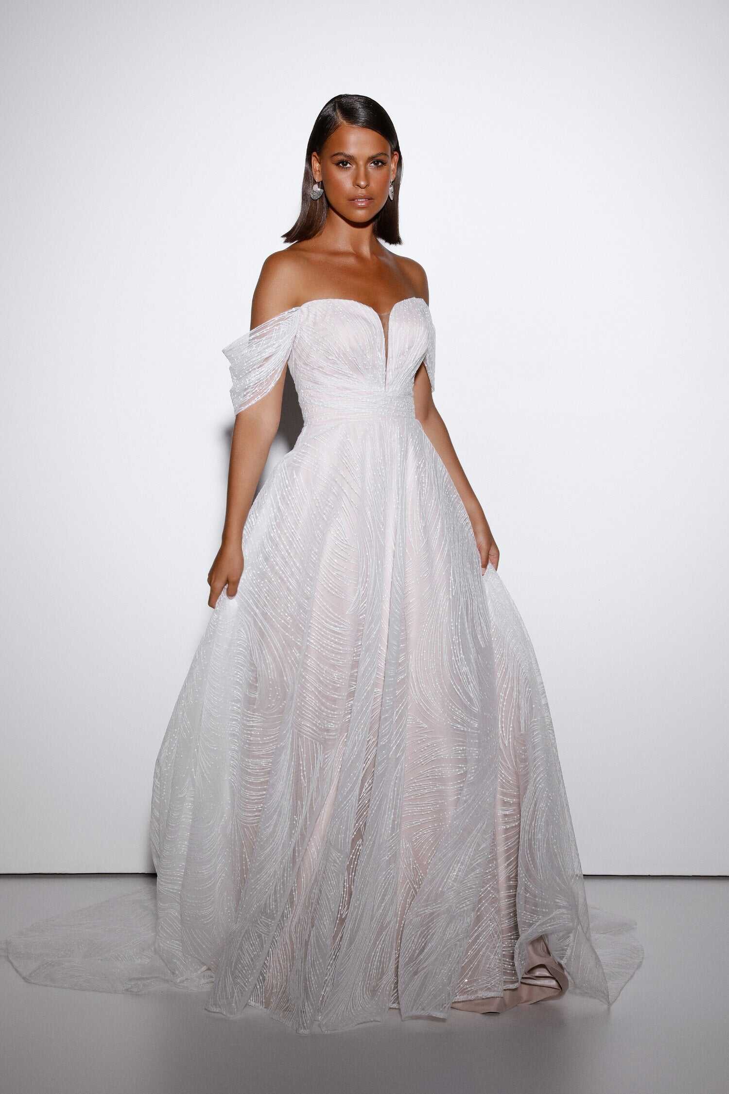 Elodie is for the bride who wants minimal lace, and soft detailing and dimension. With a romantic, strapless neckline and narrow plunge and waistline pleat accentuation, and the addition of detachable illusion pleated off shoulder straps every bride will feel like a princess. The scoop back and ¾ circle cut out skirt with all layers sewn flat to a slim waist, twirling on the dance floor and having your moment. The 16 piece boning and cup construction will give you structure and definition creating a romantic silhouette in embroidered and sequin sheet lace.