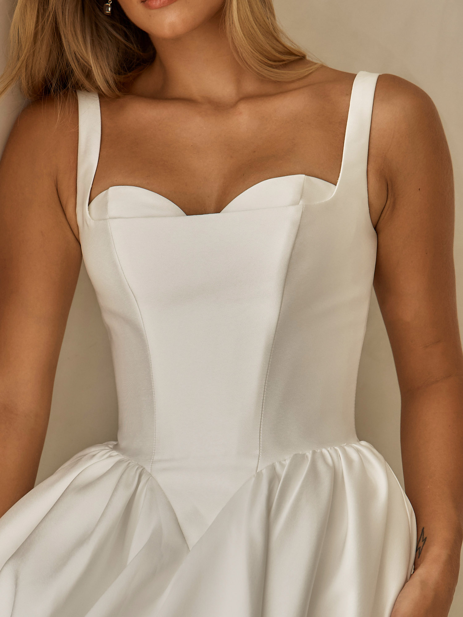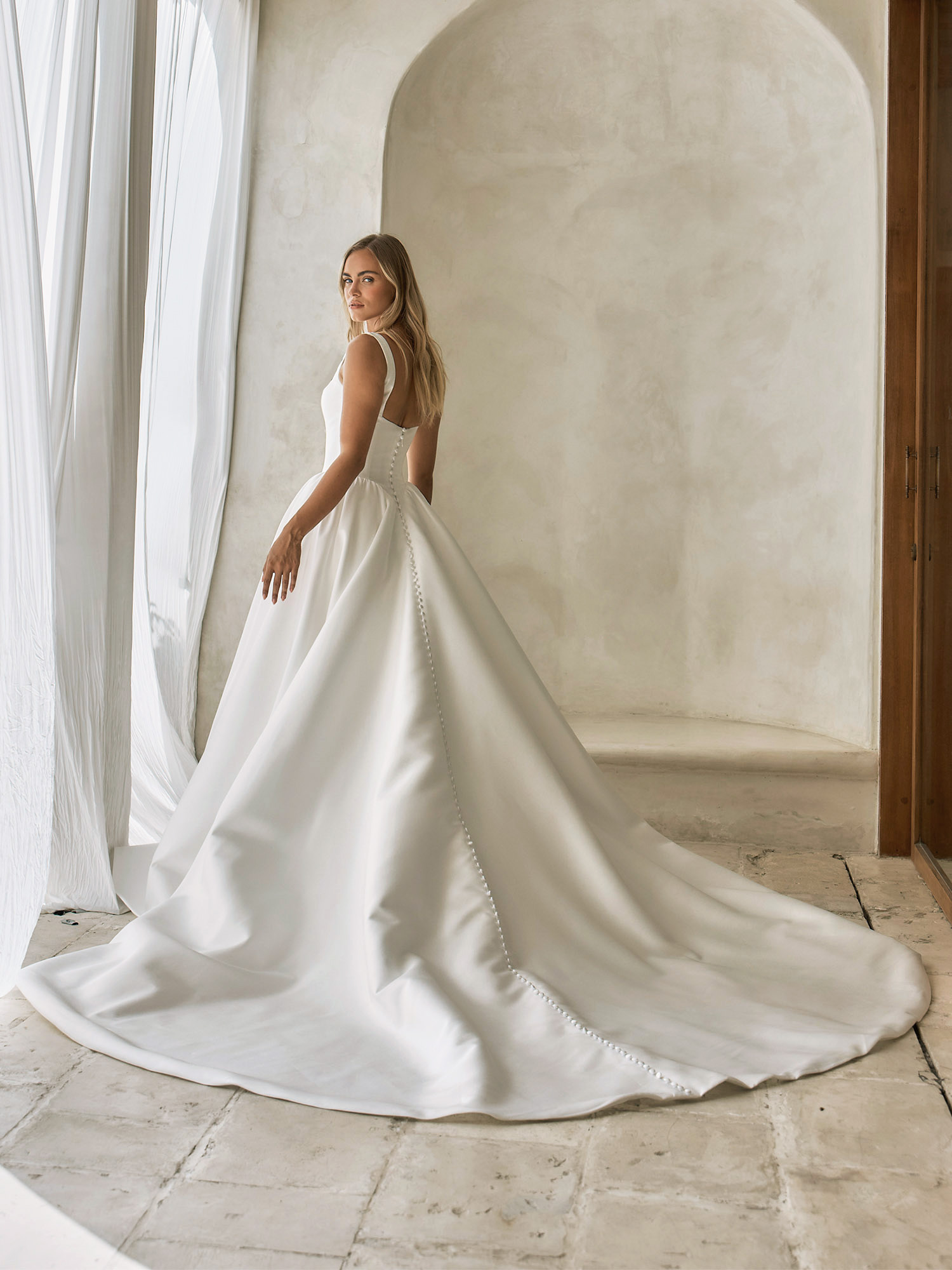 Our Teddy wedding dress is a timeless design with modern elements crafted in luxe Mikado. Ensuring a look that is minimalist, traditional, and perfectly bridal.