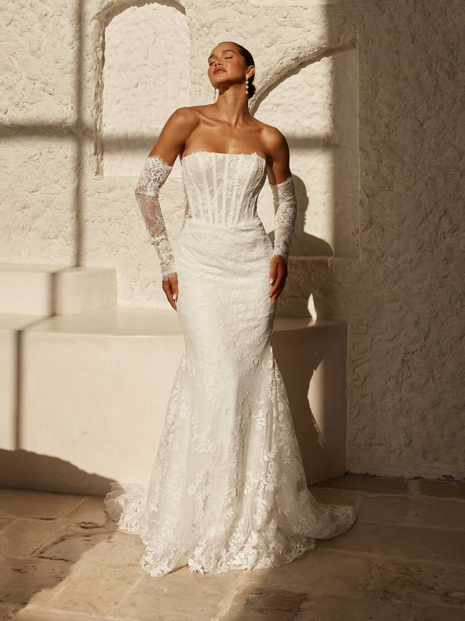 Our Zeta wedding dress is designed with modern elements for trendy brides, who desire fashion-forward inspiration in their bridal style. Composed of all-over Chantilly lace for vintage romance and contemporary illusion panels for a sensual edge.