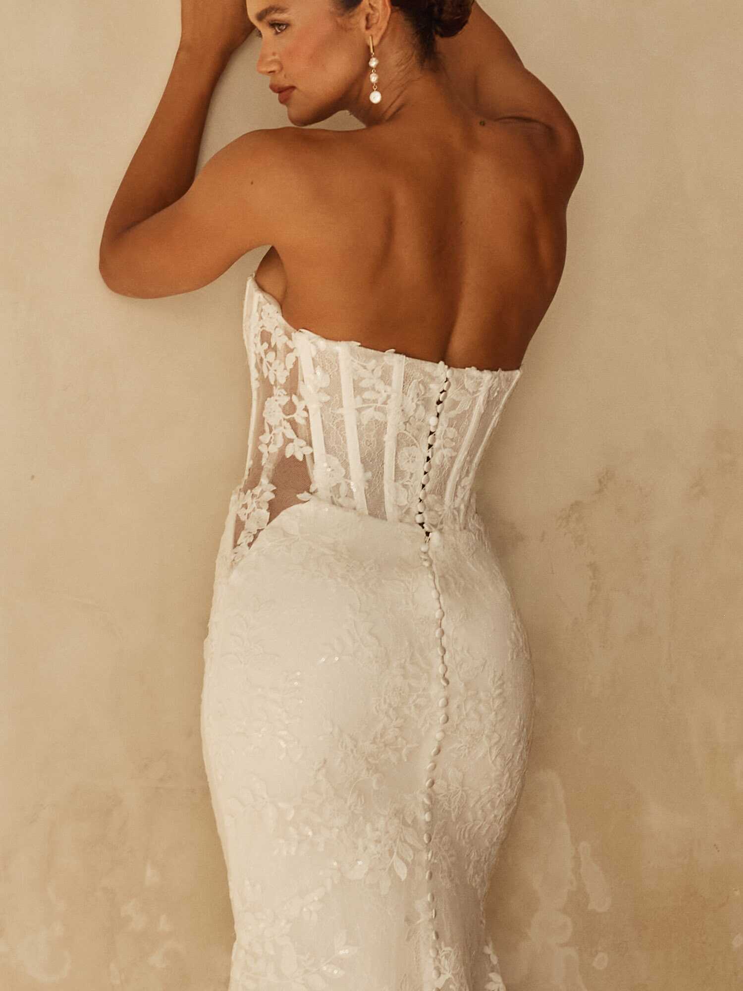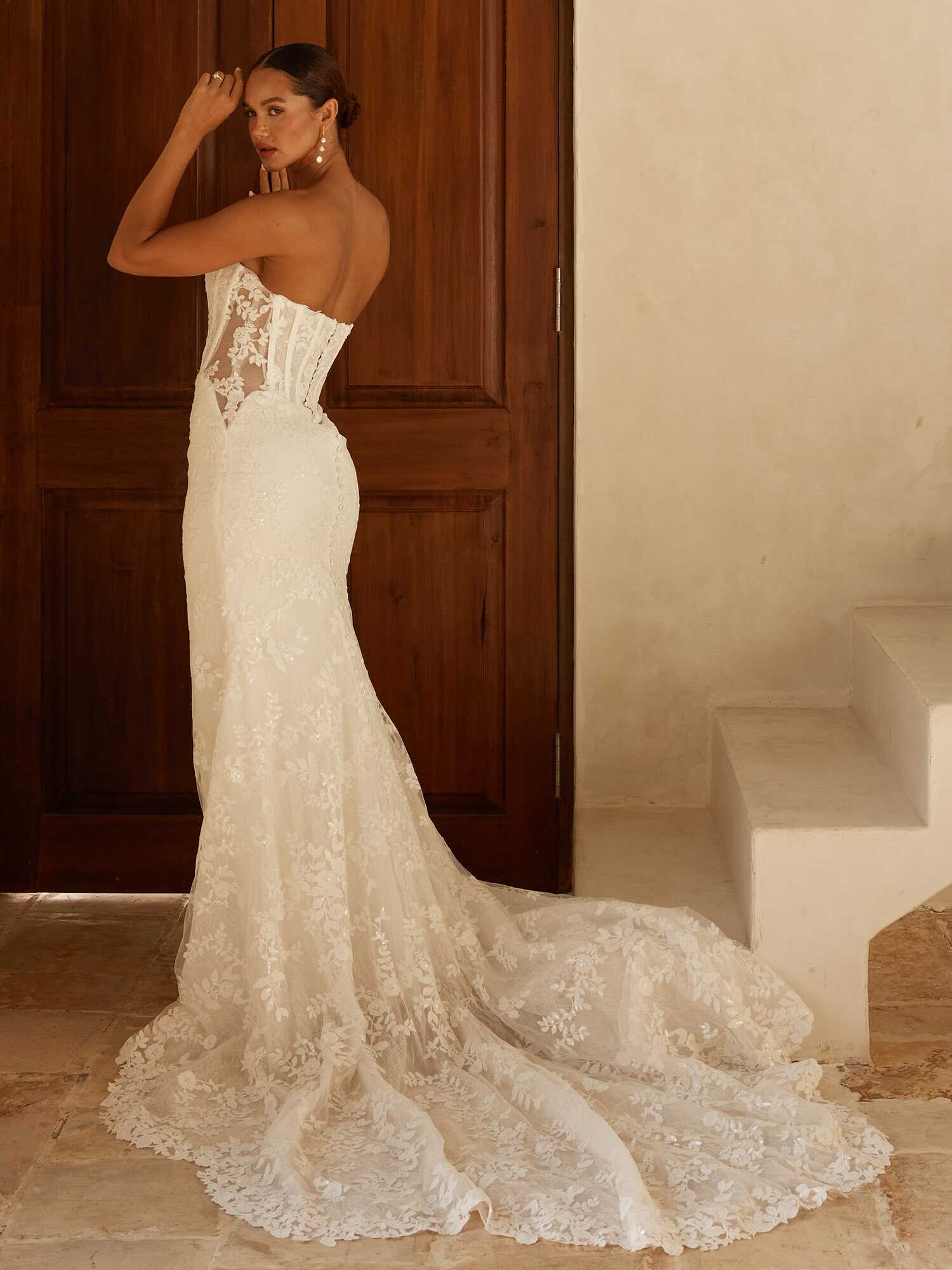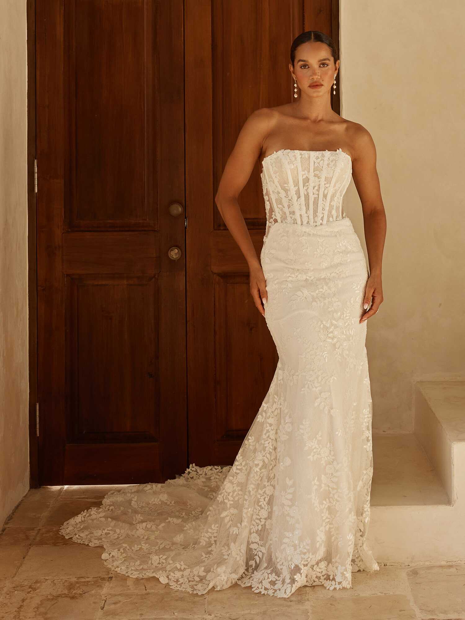 The slim-line skirt hugs the hips and flares at the knee, softly extending into the shaped illusion lace train. Completing the design with a classic bridal statement.
