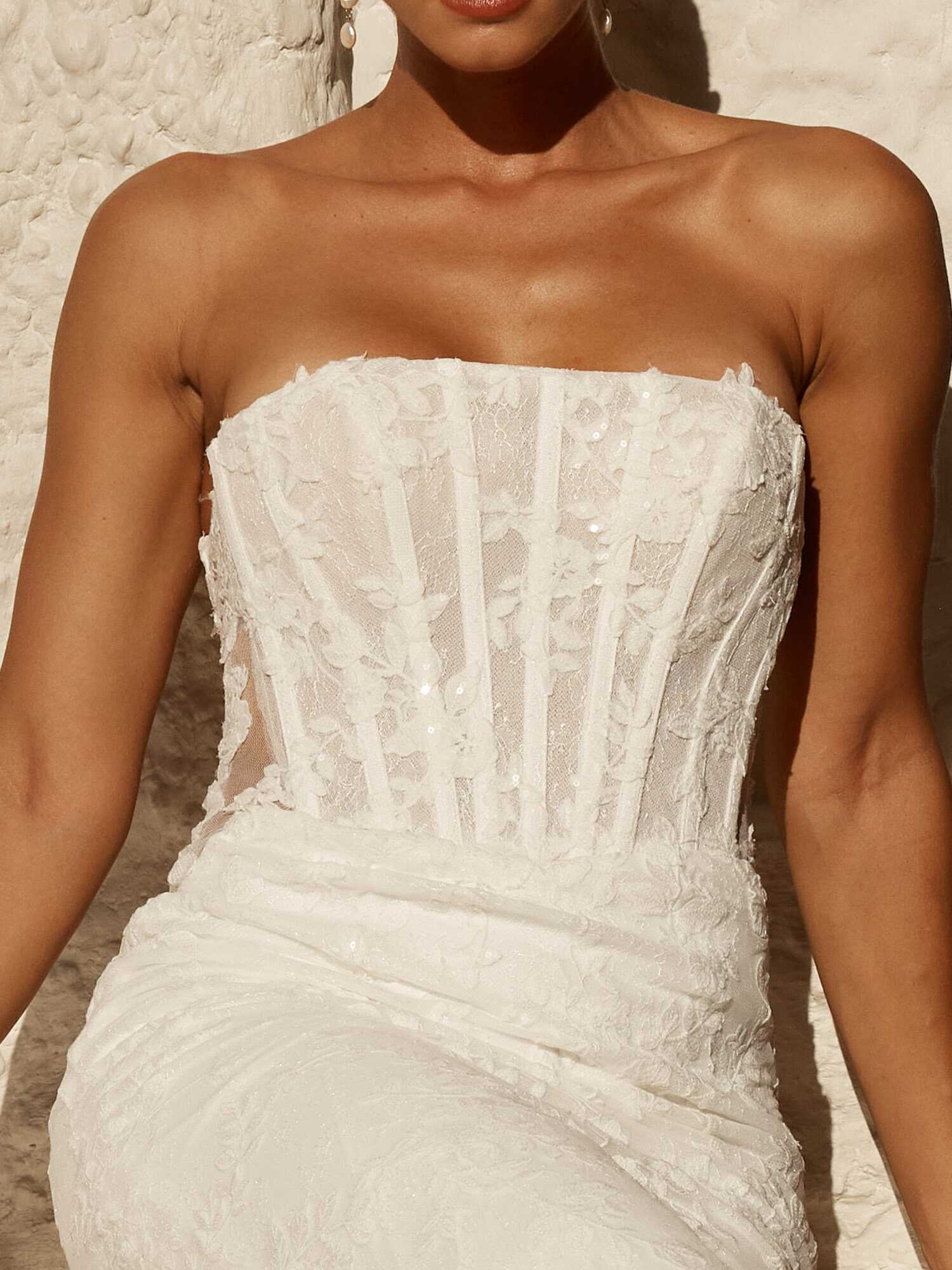 A straight, strapless neckline adorns the bodice, continuing into the detachable lace off-shoulder sleeves finished with an eyelash lace edge. The sheer Chantilly lace of the bodice creates an illusionary effect, exposing the lines of the modern boning beneath. The boning offering structure and modern detailing to the dress, while shaping the waist.
