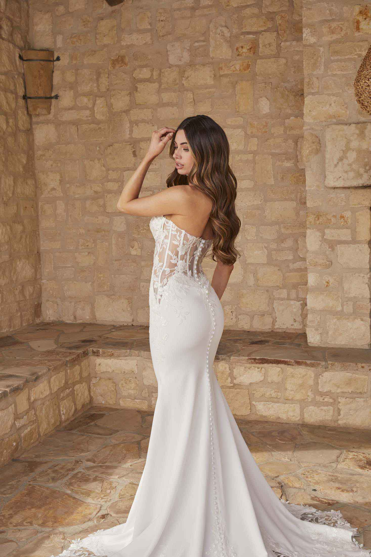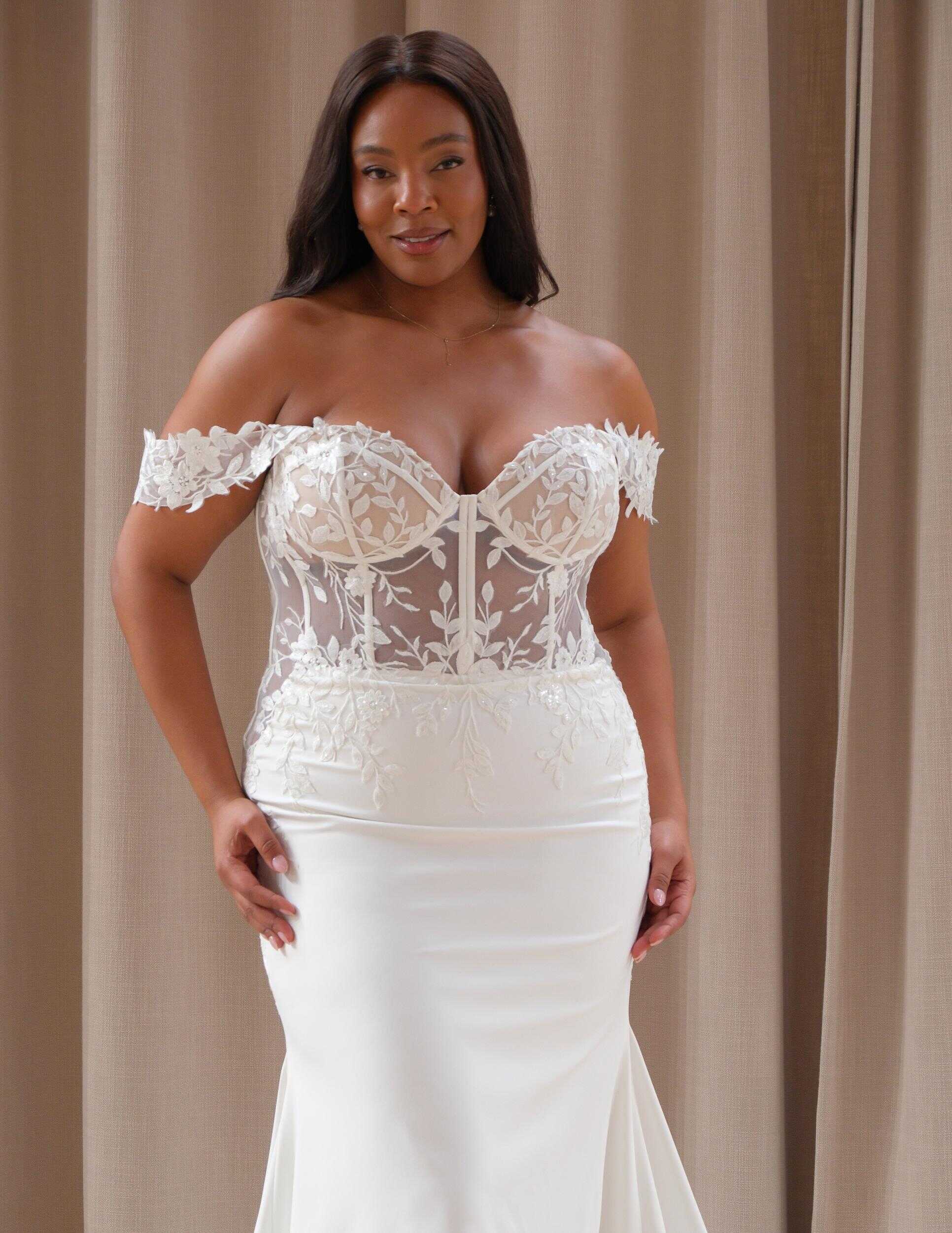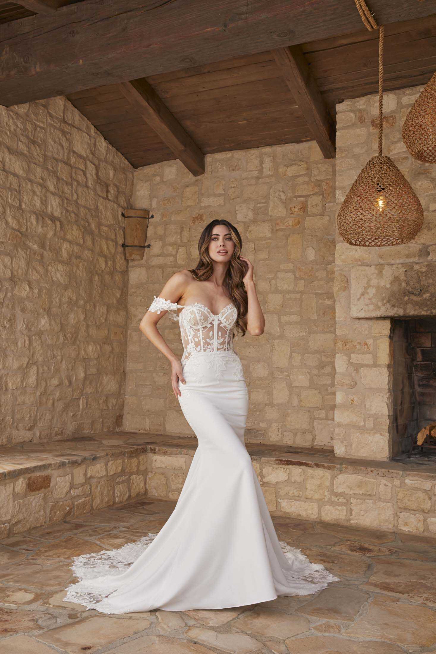 The Ameera wedding dress is a sublime fusion of lace and crepe, evoking an air of modern sophistication with a timeless allure. Ideal for the contemporary bride seeking a touch of unconventional charm, its structured sheer bodice adorned with exposed boning exudes confidence and allure. With detachable straps for added versatility, this gown caters to the bride yearning for a customizable look. The fitted crepe skirt, accentuated by side cutouts, offers a sleek silhouette, perfect for a chic urban affair or an elegant garden celebration. Drawing inspiration from the understated elegance of French couture, the Ameera dress is a tribute to the effortless beauty of Parisian brides, epitomizing grace and refinement while embracing individuality.