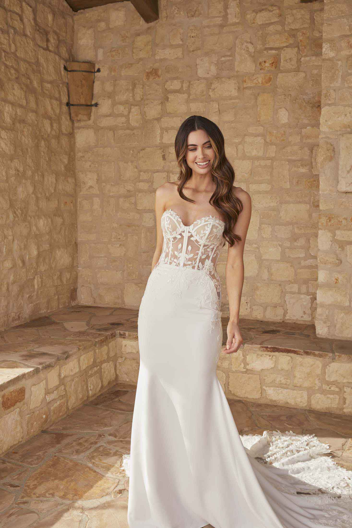 Modern lace and crepe gown with structured sheer bodice and detachable straps, embodying Parisian elegance with a touch of allure.