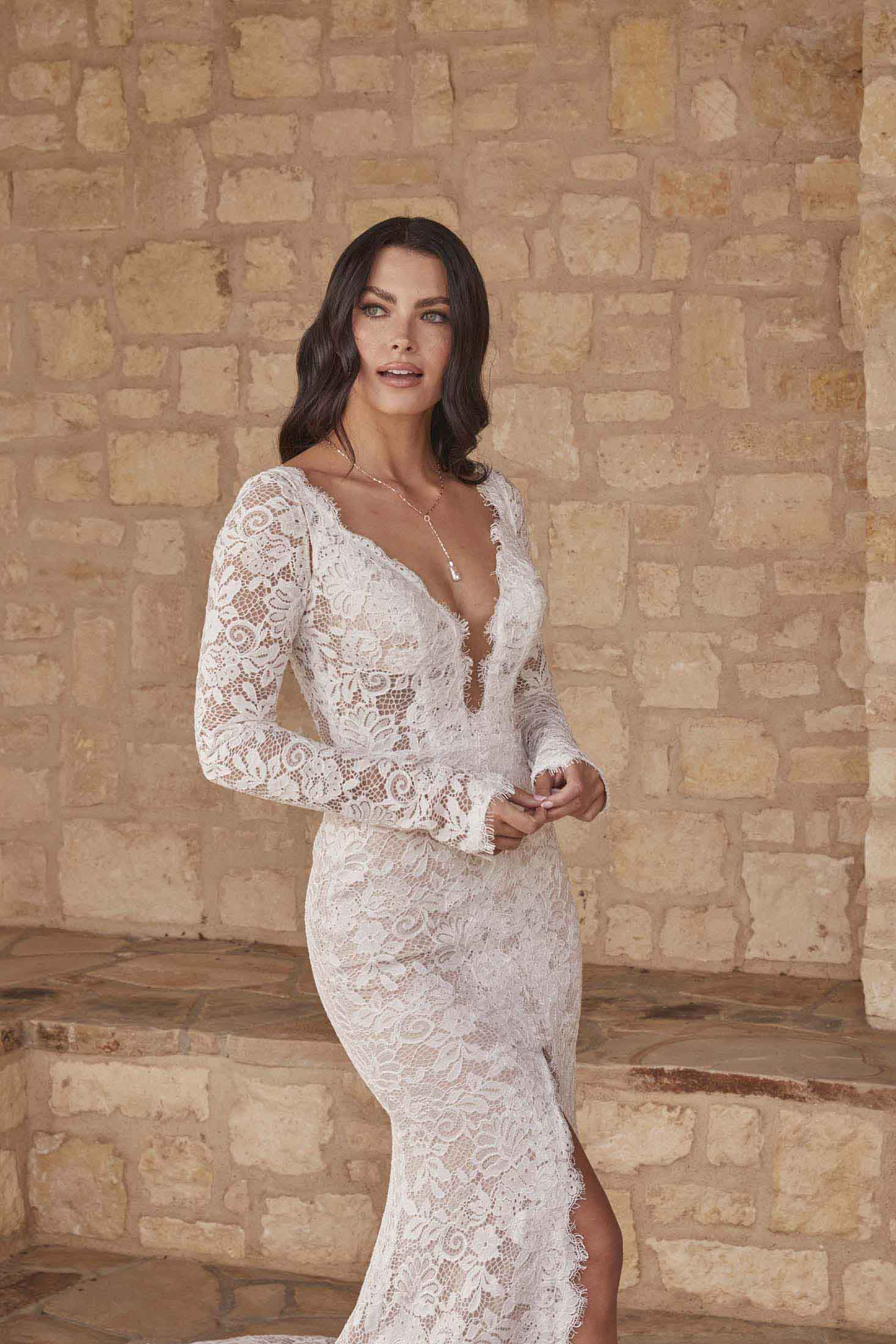 Timeless lace gown with a captivating plunge neckline and detachable long sleeves, perfect for brides seeking classic elegance with modern allure.