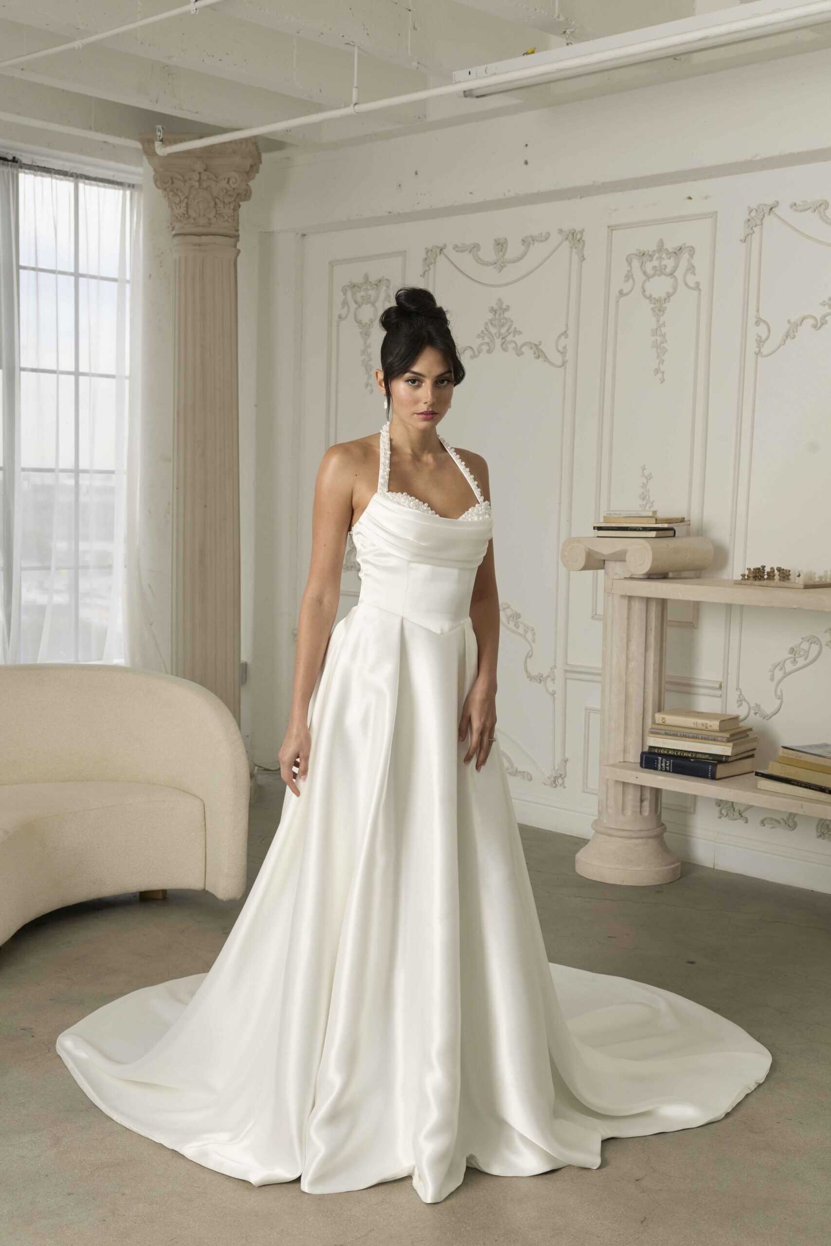 A classic A-line gown with a structured bodice and halter neckline, softened by delicate lace trim. The satin fabric lends a timeless feel, while the draped neckline adds subtle vintage charm.